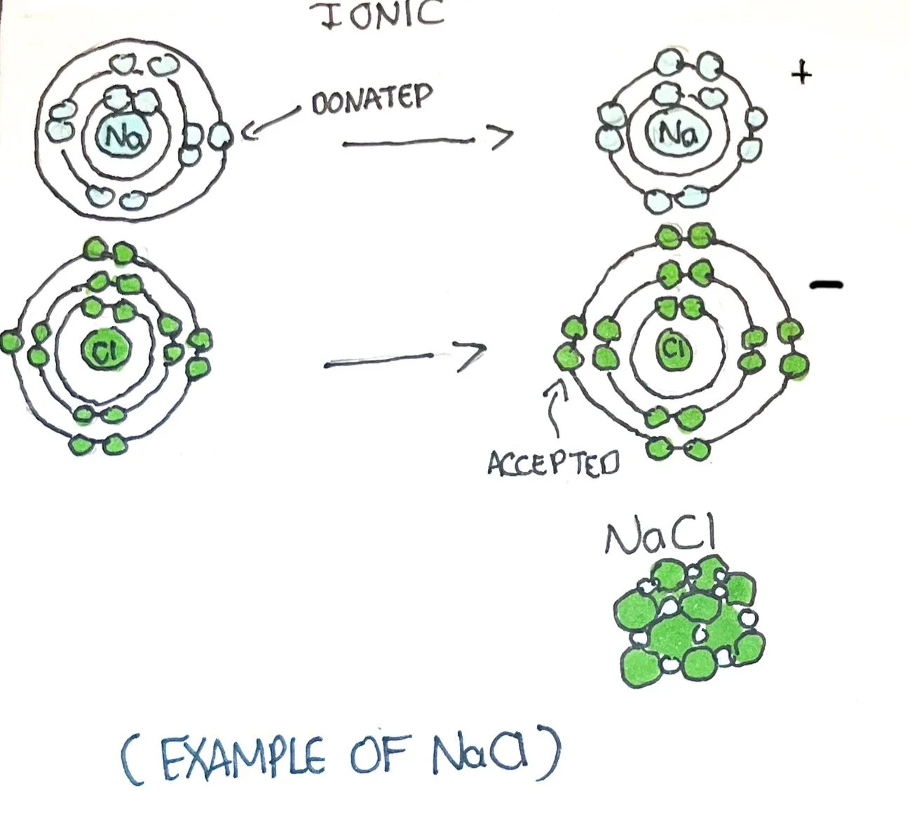 The force of attraction between the cation and anion creates the ionic bond. The ionic bond satisfies the octet rule by containing 8 electrons within the valence shells of each atom. Breaking of the ionic bond will lead to cations and anions within body fluid - this is known as electrolytes since atoms have a positive or negative electrical charge.¹