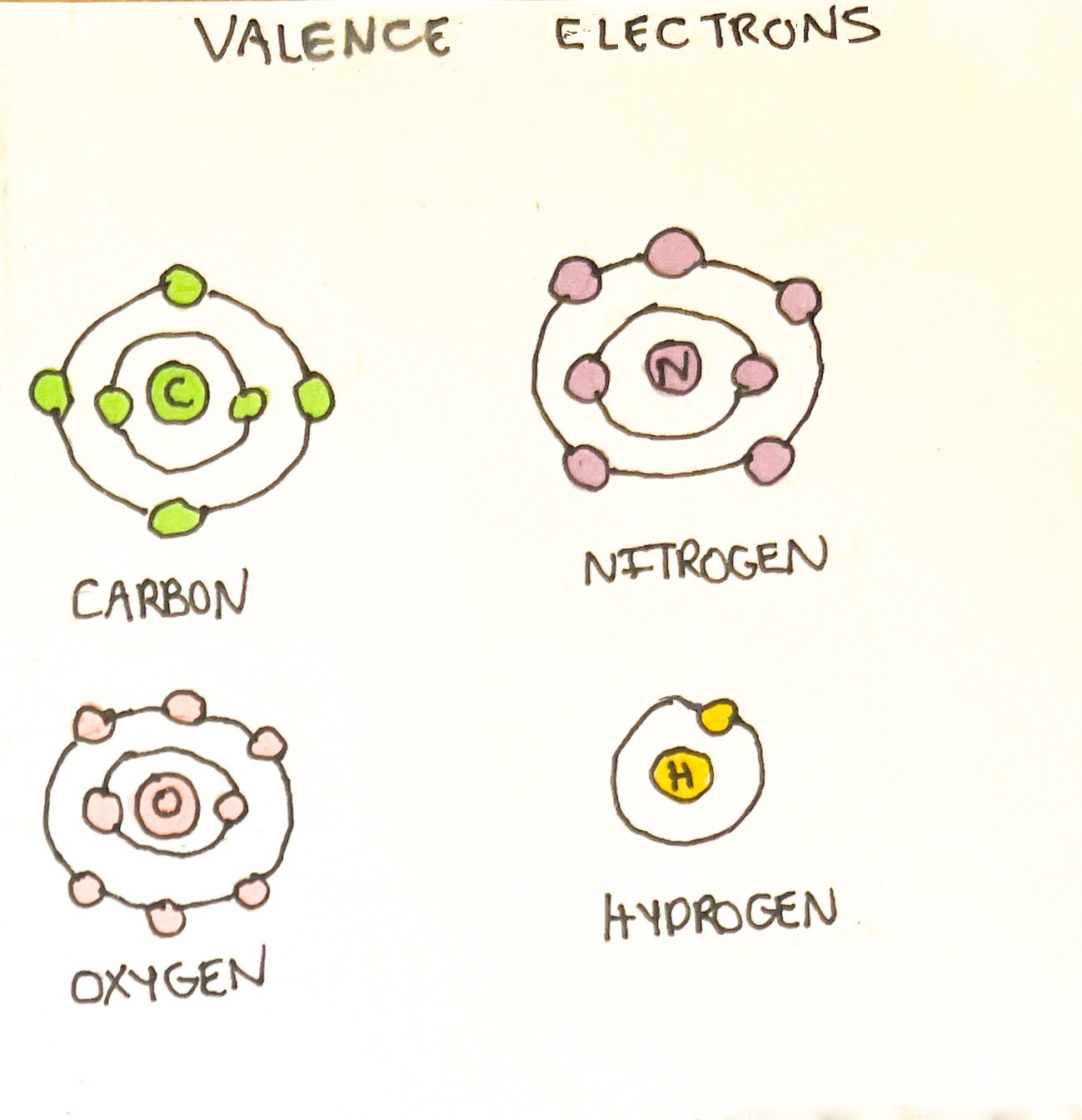 The valence shell is the outermost electron shell. This shell would like to contain eight electrons whether it is donated or shared.¹ Most atoms strive to achieve this configuration to satisfy the octet rule. Hydrogen only has 1 valence electron but can bind readily to other atoms.¹ It requires 2 valence electrons to reach stability - an exception from the octet rule. This is useful to know to understand the types of pairings/chemical bonds between atoms.