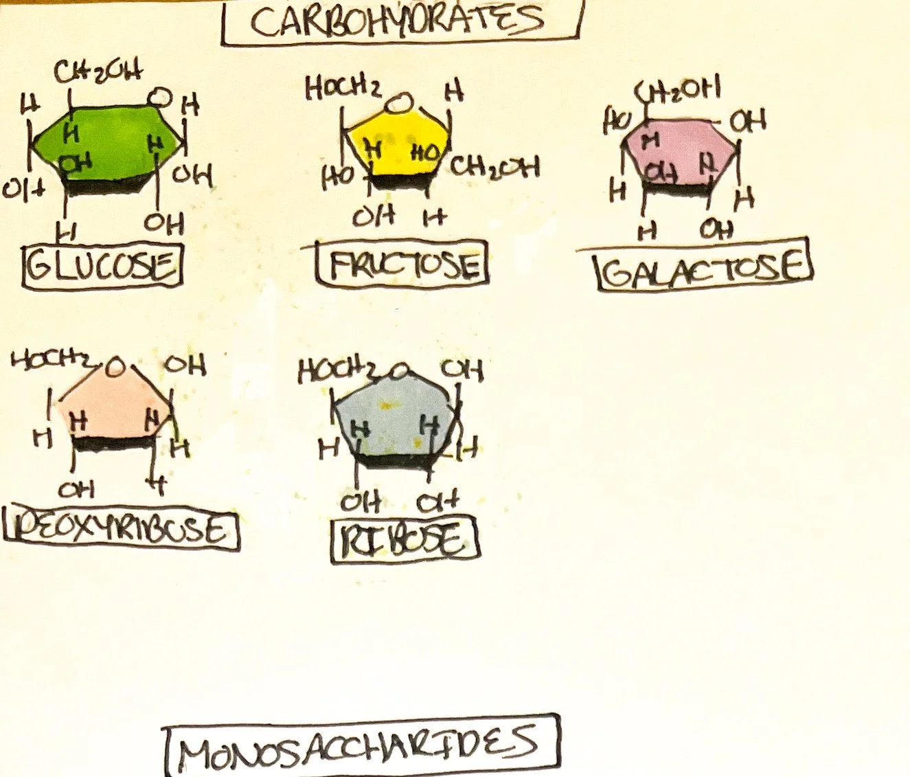 Glucose/Dextrose: referred to as ‘blood sugar’. Found in some ripening fruits and vegetables, but hydrolysis of disaccharides and starch is the primary method of glucose within the diet.