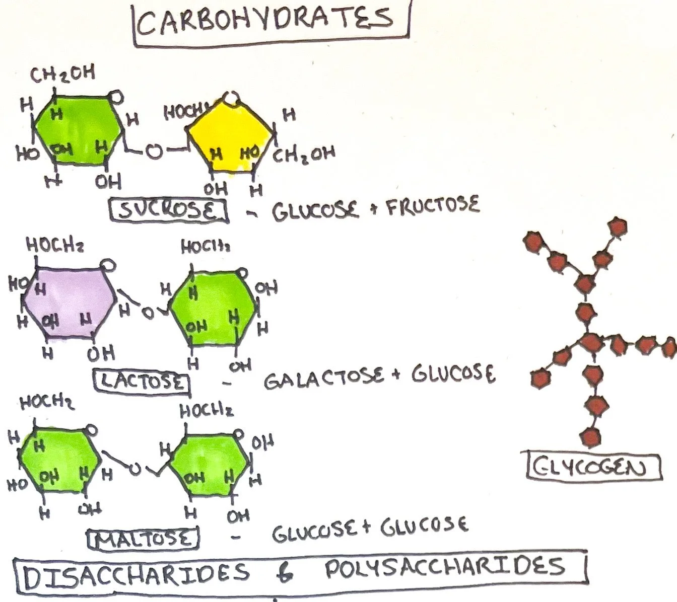 Maltose: Glucose + Glucose, which is malt sugar. It is not significantly found in the diet alone but is a product of polysaccharide digestion.¹