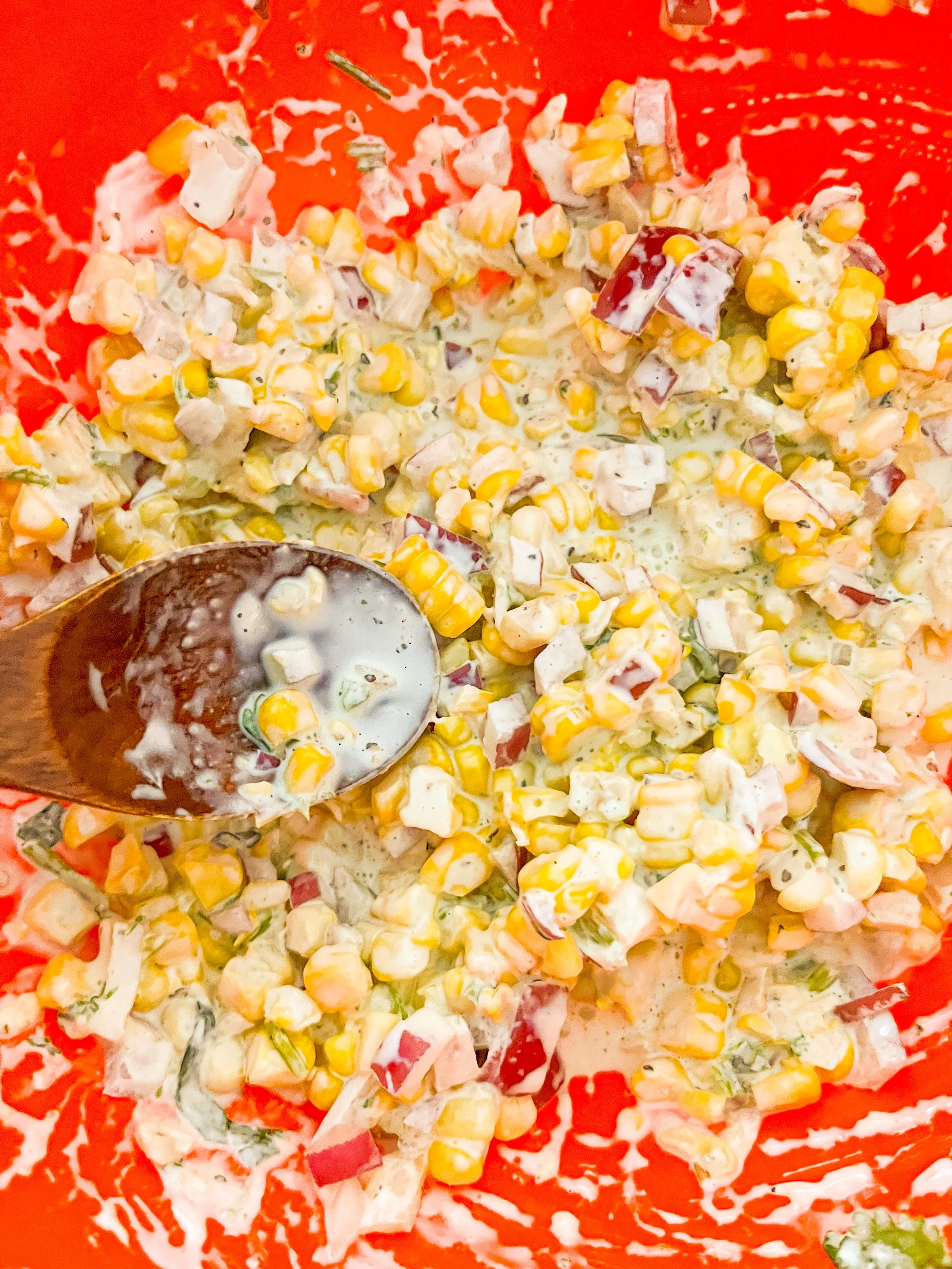 2. Combine all prepped ingredients with corn and stir in with seasonings, mayo, and sour cream.