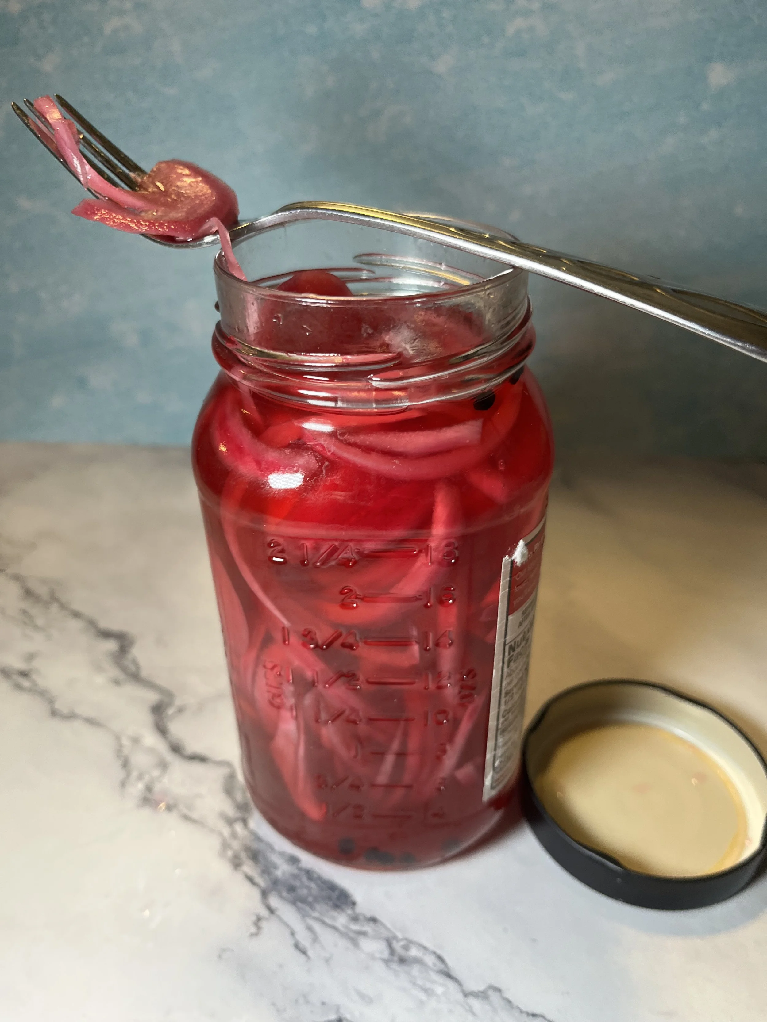 Quick pickled onions can be stored on the countertop or fridge for several months (recommend no longer than 3 months on the countertop). Use a clean, non-metal utensil to remove onions from jar.