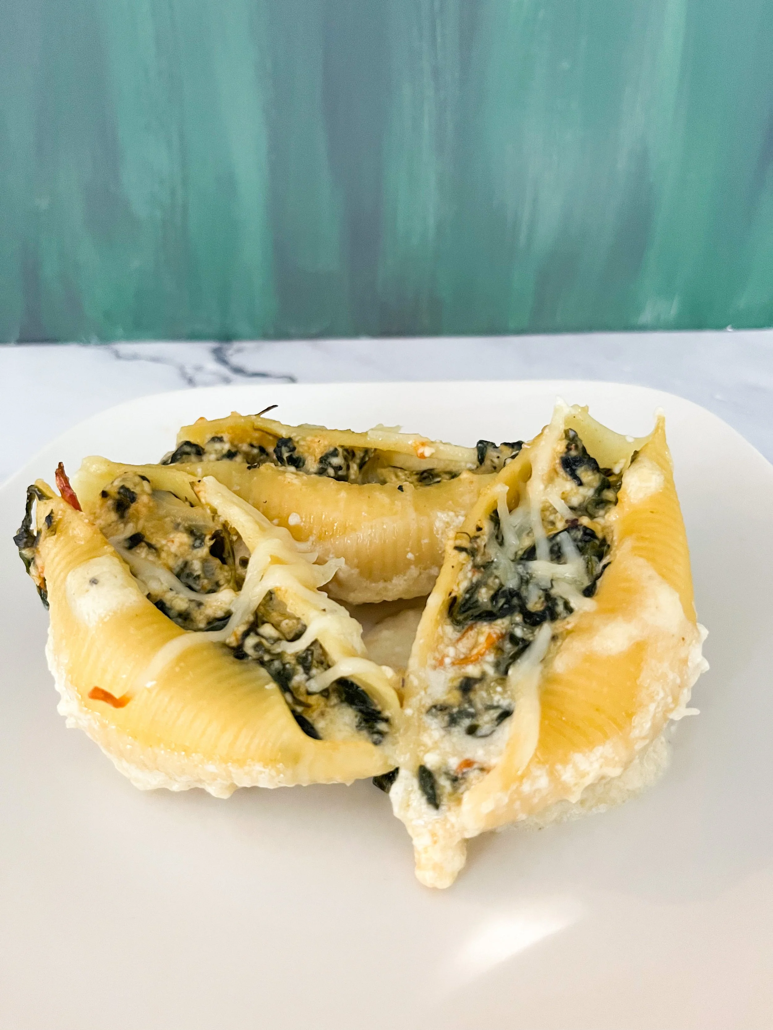 This recipe combines spinach and ricotta cheese within shell pasta and a milk-based sauce. The spinach is sautéed with tomatoes, onions, and garlic creating a savory, rich filling. The creaminess of the ricotta cheese and garlicky sauce works well with the stuffed shells. Pair with a crusty bread or side salad. Hope you enjoy it!
