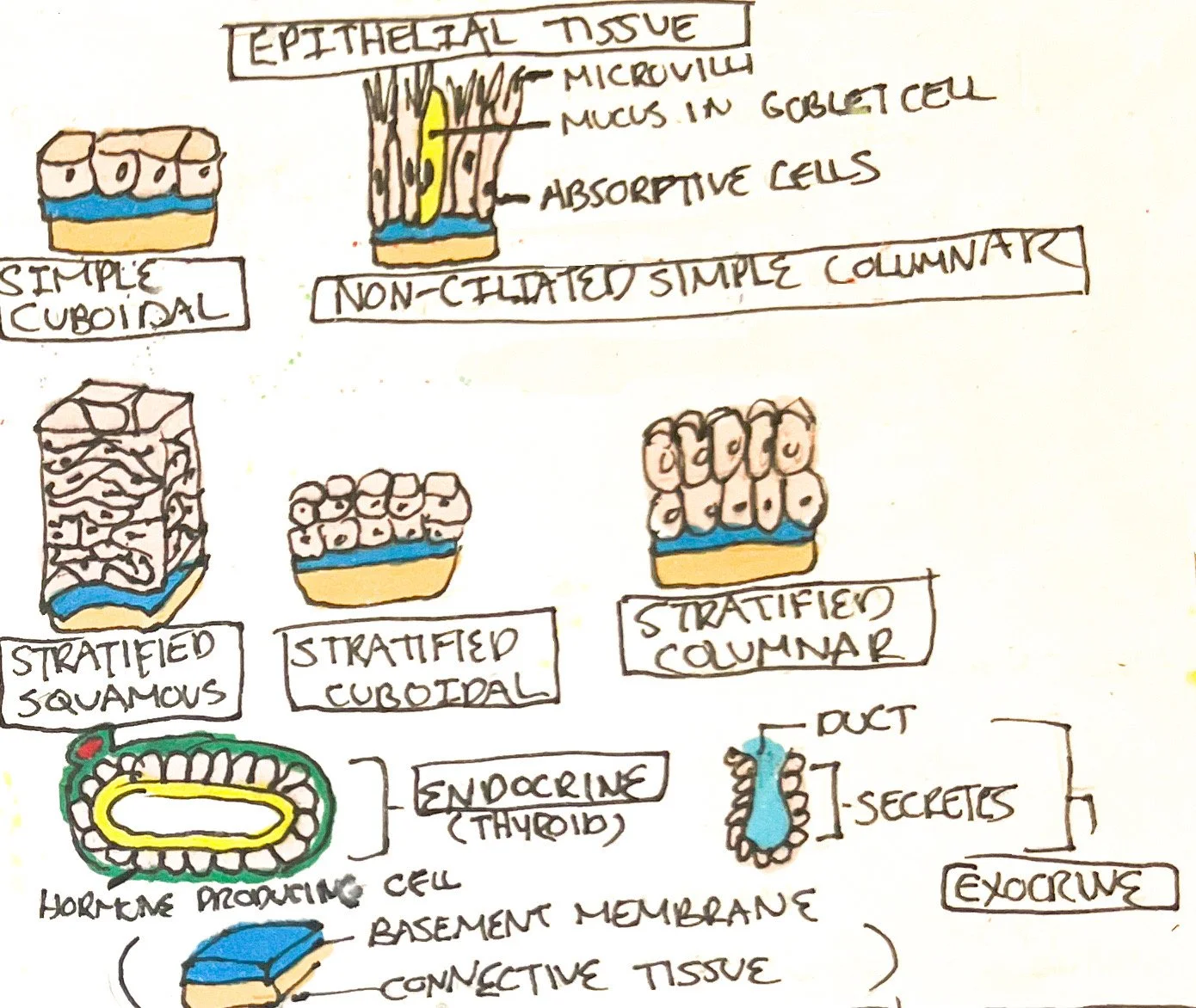 Epithelial Tissue: found as the outer covering (skin) and lines organs, ducts, and glands. Epithelial tissue in selected systems can secrete hormones, mucus, and enzymes; it can also absorb nutrients and excrete wastes.¹ The examples listed below are specific to the GI tract and its accessory organs.