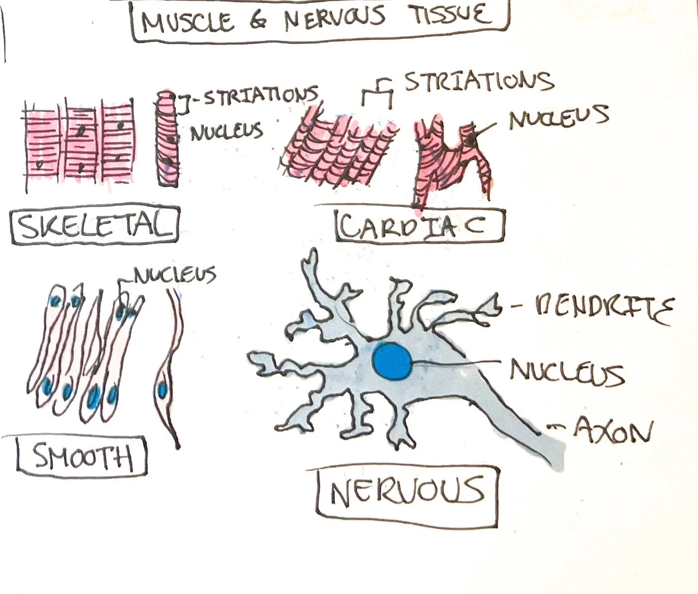 Muscular Tissue: found within organs that contracts and expels force, allowing for movement.