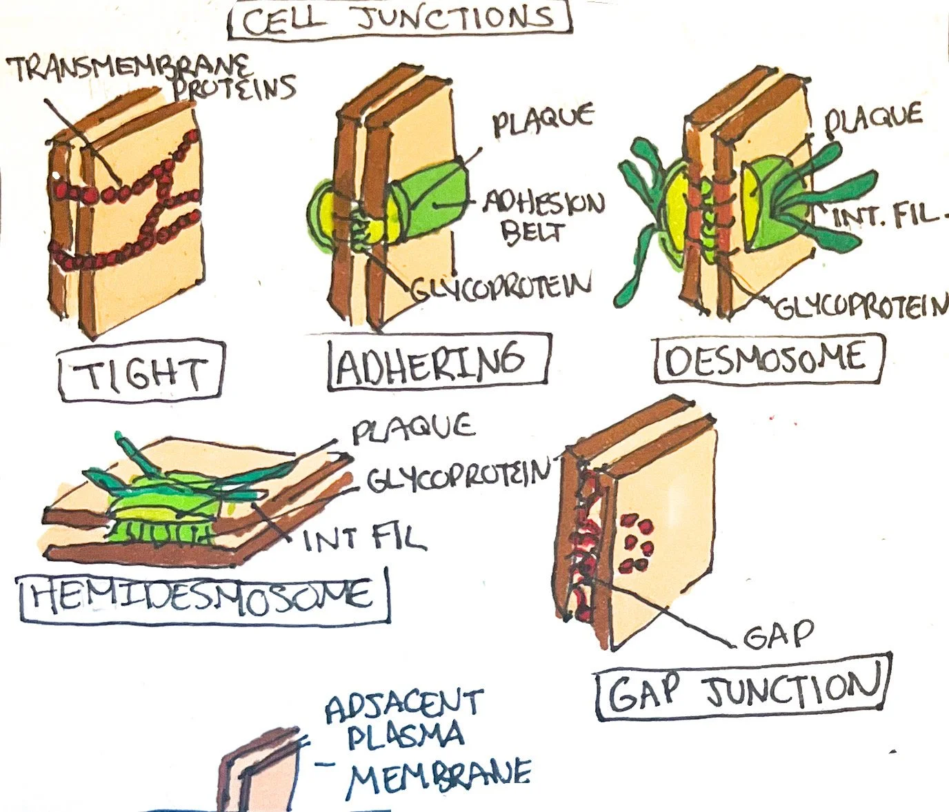 Adhering Junctions: A layer of proteins, known as plaque, forms adhesion belts within microfilaments and holds adjacent plasma membranes together with glycoproteins to secure each side together.¹ Found in the intestines to prevent spillage from chyme movement.